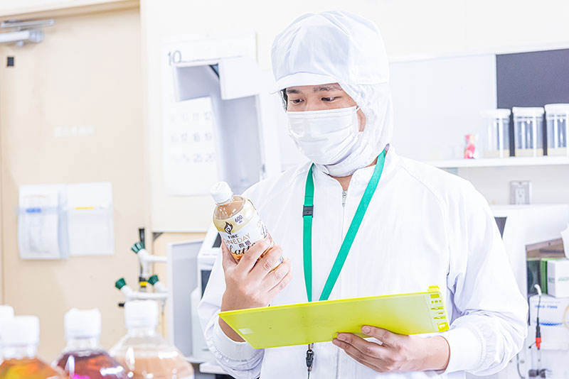 原料の受入検査から出来上がった製品の最終検査まで数多くの厳しい検査を行い合格した製品のみが出荷されます。その検査の項目の中で、調合工程の中味液の分析は精密機器で検査し基準値内であることで、正常に工程が進んでいるかを確認し、異常の無いことを判断した上で次工程に進めます。また、製造中には一定時間毎に内容量検査や巻締検査(容器とキャップが適正に密封されていること及びキャップの開け閉めに異常がないか)を実施しています。これまでに積み重ねてきた測定データは傾向管理されており、よりよい製品づくりのため役立てています。また、食物アレルゲン物質の簡易検査を行い、消費者の皆様に安全で安心して飲用していただける製品づくりを目指しています。